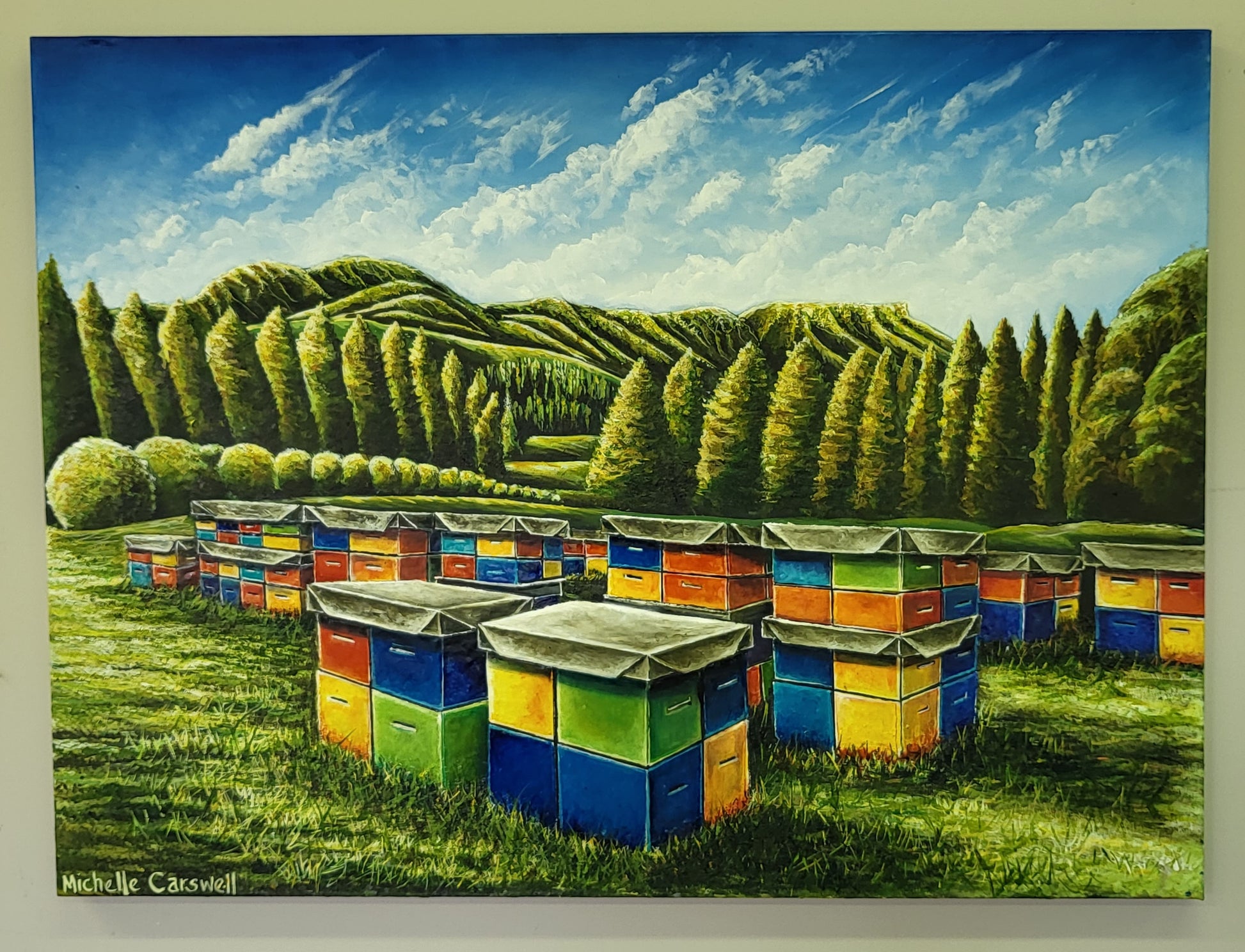 Oil on Canvas - with resin overlay over the colourful beehives.